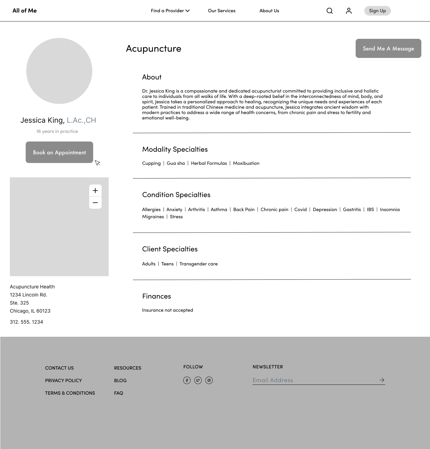 By using sectioning and clear labels, providers are able to customize their pages to provide the topics most important to patients including location, specialties, and payment types accepted.