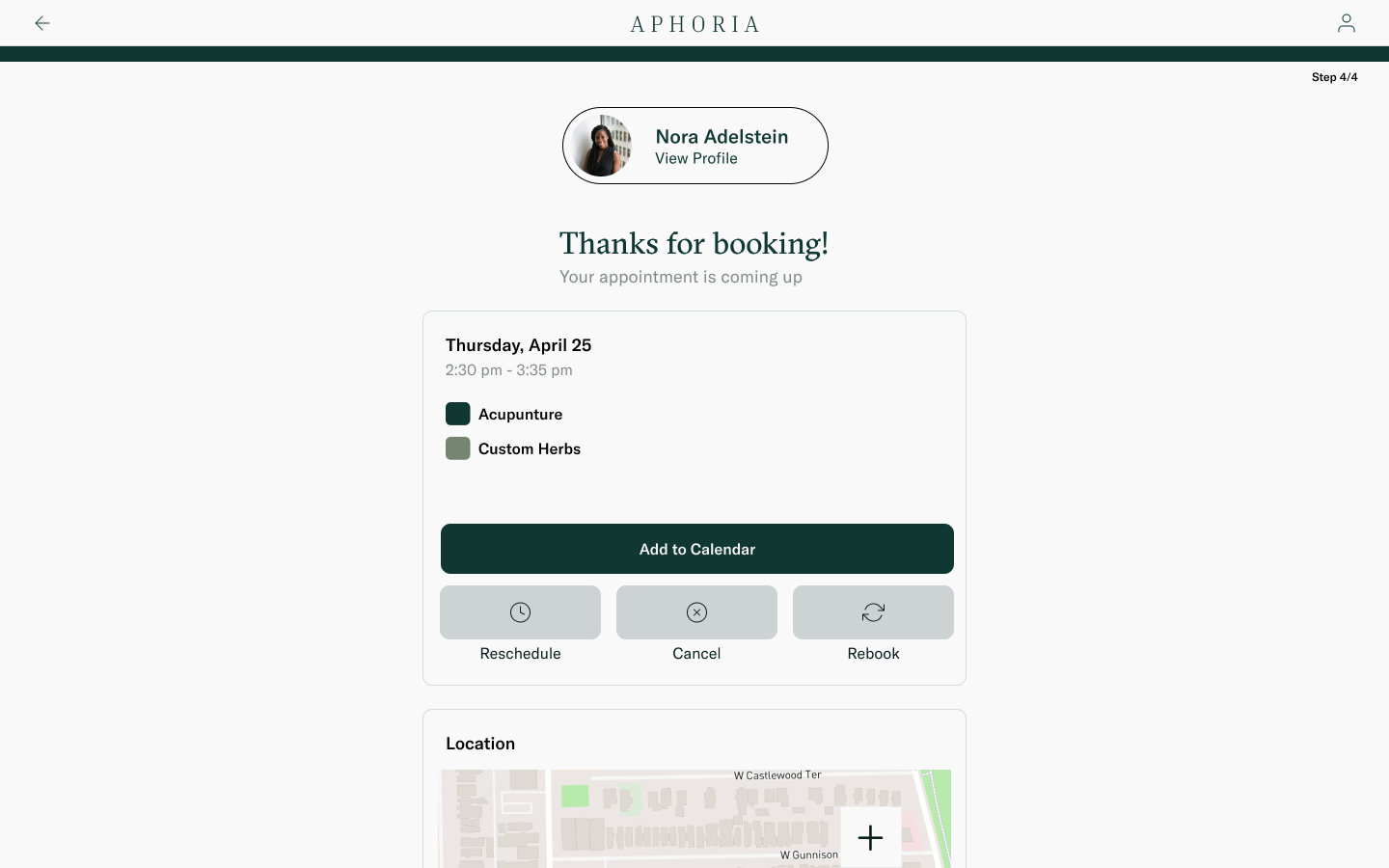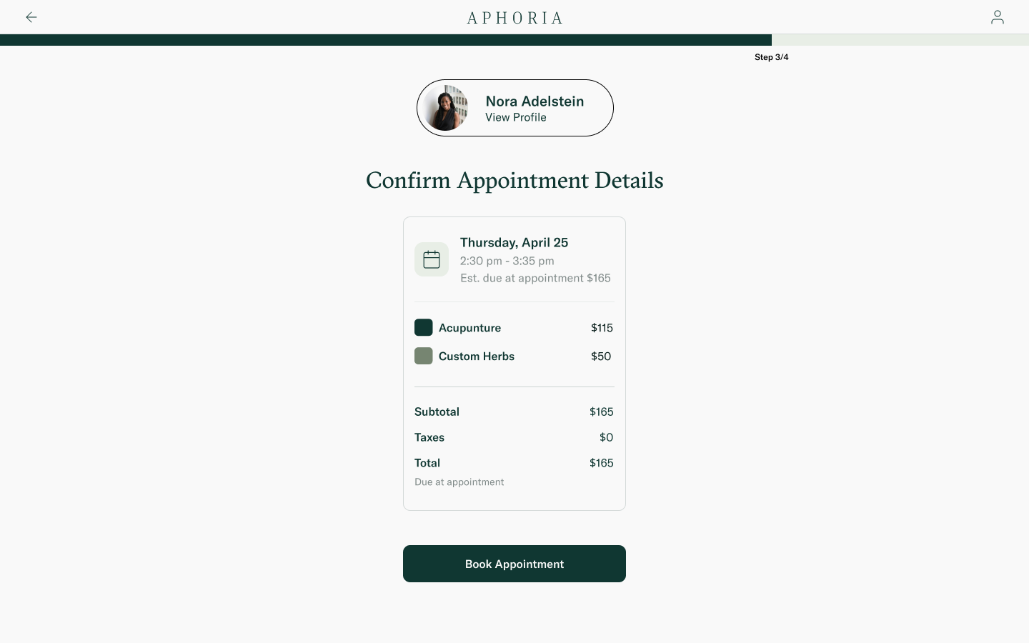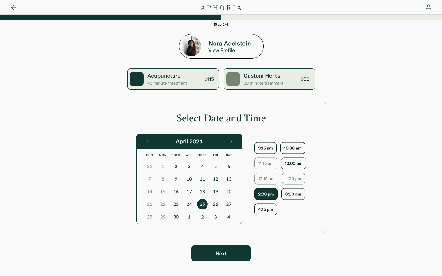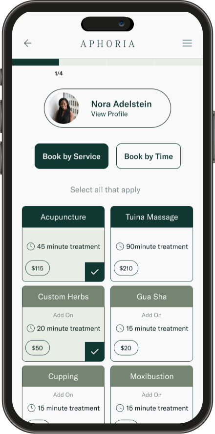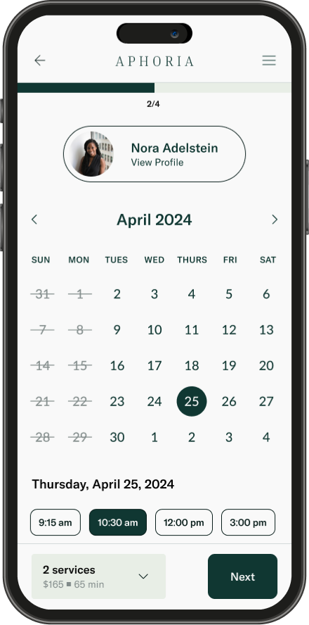 Due to the variety of topis and services offered, Aphoria offers providers customizable cards so patients can book appointments as easily as possible. Patients can book based on either services offered or time available.