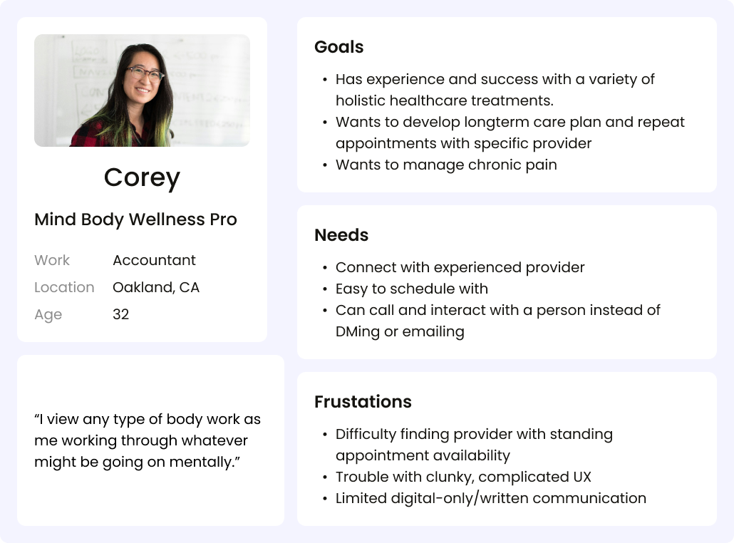 I conducted and moderated 13 one-on-one ~hour long interviews with former and current patients, and holistic healthcare providers. One of the biggest surprises was how many users found their providers through their insurance companies instead of word-of-mouth as previously hypothesized. There was also a very wide range of preferred communication methods including text, e-mail, and phone call.
