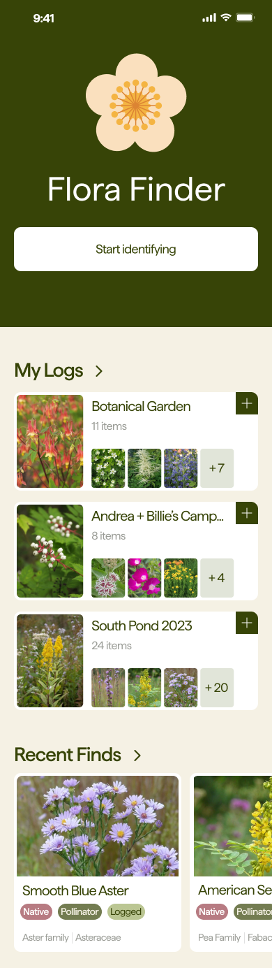 Thoughtful consideration was given to the visual design of Flora Finder. In addition to elements such as font and color, it was necessary to be mindful of the fact that all of the data is going to be viewed on a smaller screen, and most often used outdoors. This lends itself to a very earth tone color palette and components that focus on readability.