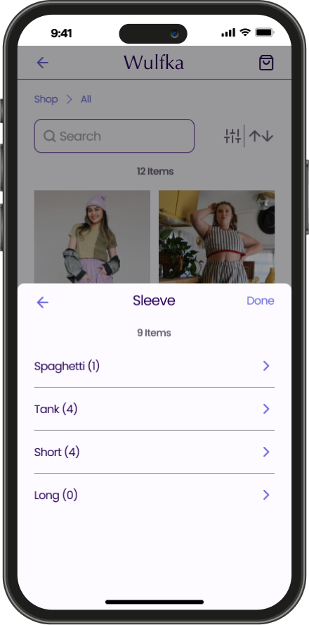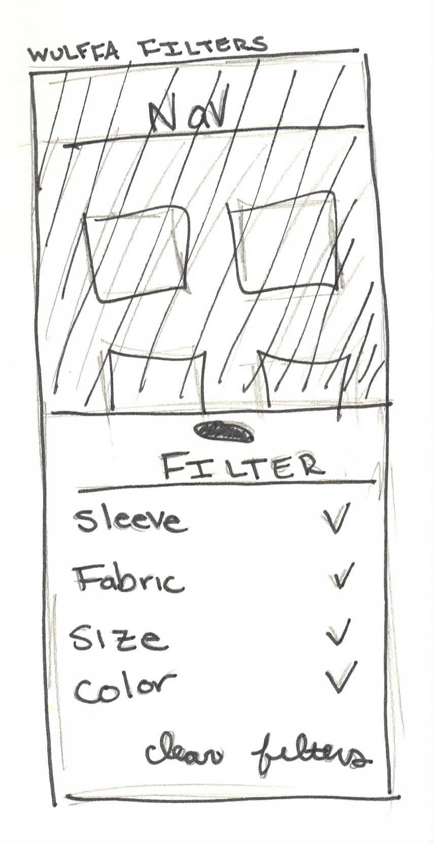 A vital feature indicated during user interviews was the ability to filter garments. When users were asked what generally frustrated them with specific brand apps they had downloaded in the past, they responded with negative or non-existent filtering experiences. While Wulfka has a small, curated inventory, being able to search and filter for specific items is a very necessary feature.