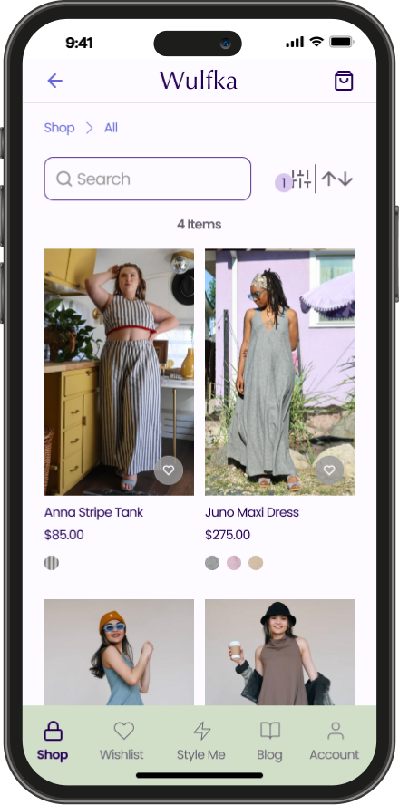 Wulfka is a well-established Chicago sustainable fashion brand owned and operated by Kate VanAsten. The hypothetical Wulfka app was designed with owner and customer needs prioritized featuring elements such as detailed filtering options, and detailed model measurements and size charts. By promoting sustainable, long-lasting garments designed for sizes XS-4XL, Wulfka can increase sales and repeat happy customers.